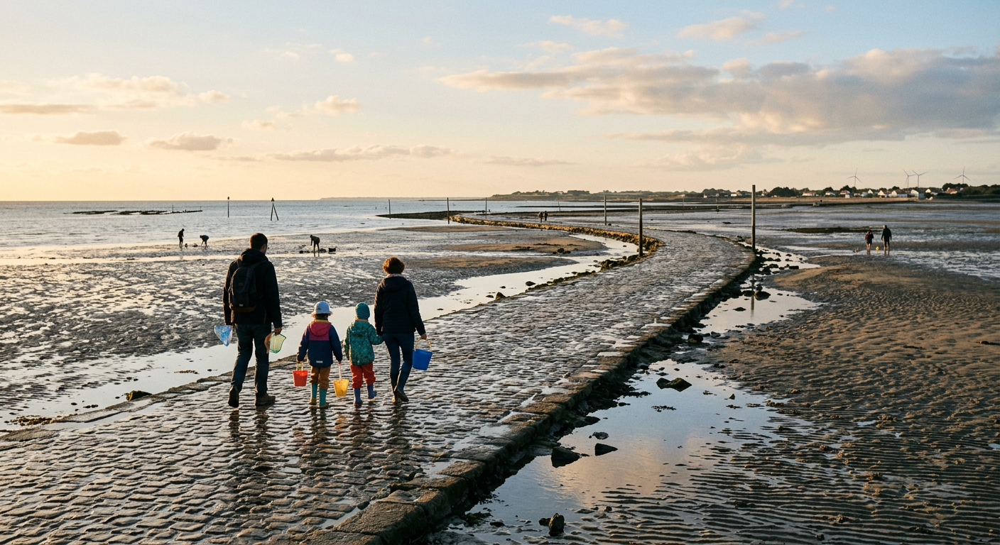 Dès que l'eau se retire, le Gois devient le terrain de jeu favori des familles. Munis de vos seaux et de vos épuisettes, vous pouvez vous adonner à la pêche à pied. C'est une activité ludique et pédagogique où l'on part à la recherche de coques, de palourdes ou de bigorneaux cachés sous le sable et entre les pavés. Attention toutefois à bien respecter les tailles minimales de capture pour préserver l'écosystème !