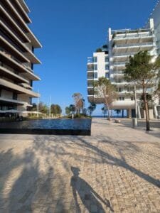 Entre mer et architecture contemporaine, La Place offre une vue dégagée sur la Méditerranée et met en valeur les bâtiments élégants et les jardins méditerranéens du projet Mareterra.