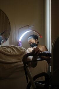 Un moment doux où maman prend soin d’elle, tout en ayant son enfant près d’elle.