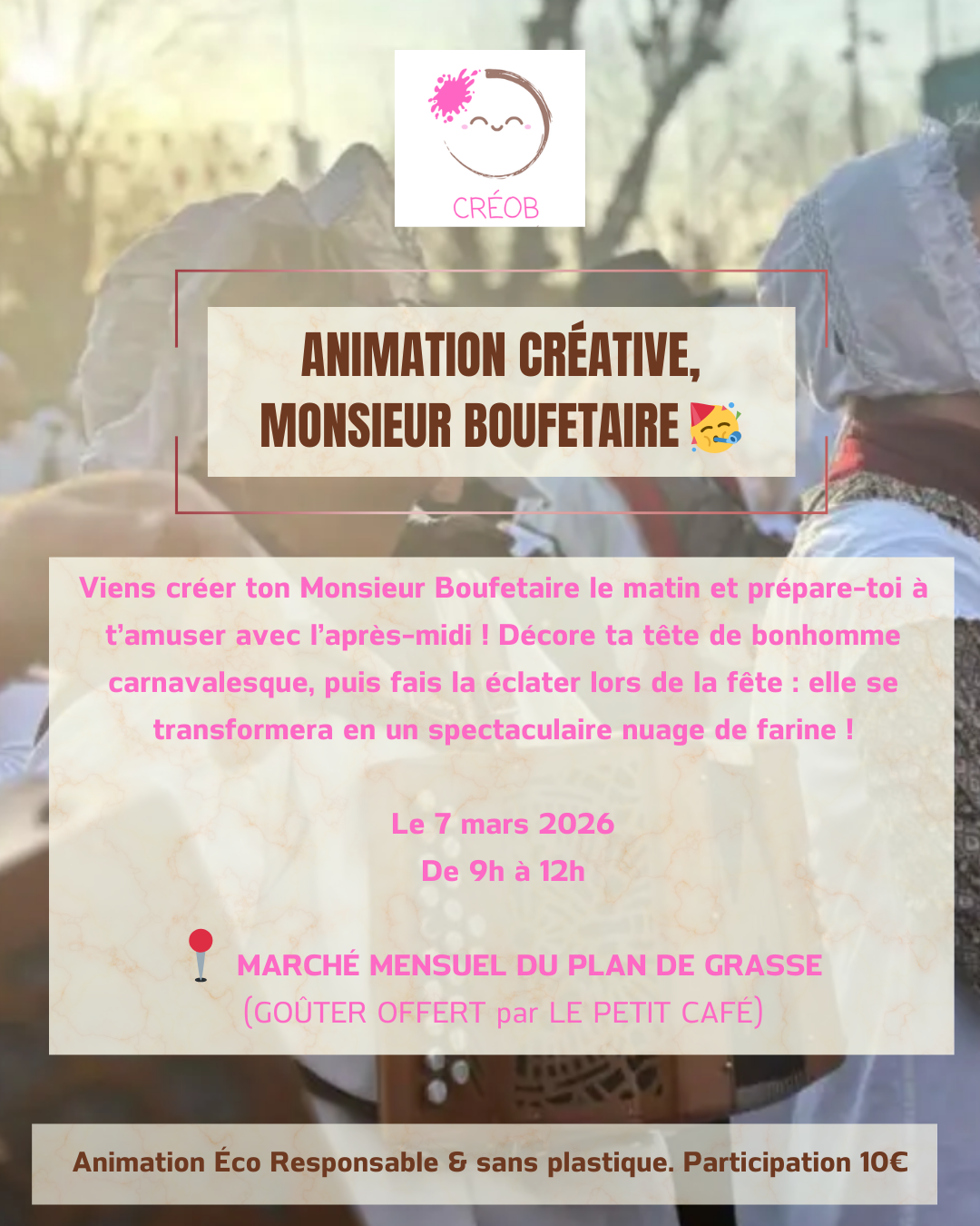 Organisée par Créob, cette animation carnaval propose aux enfants de créer leur propre Monsieur Boufetaire. Chaque participant décore une tête de bonhomme carnavalesque avec couleurs, accessoires et éléments créatifs pour lui donner un style unique et festif.