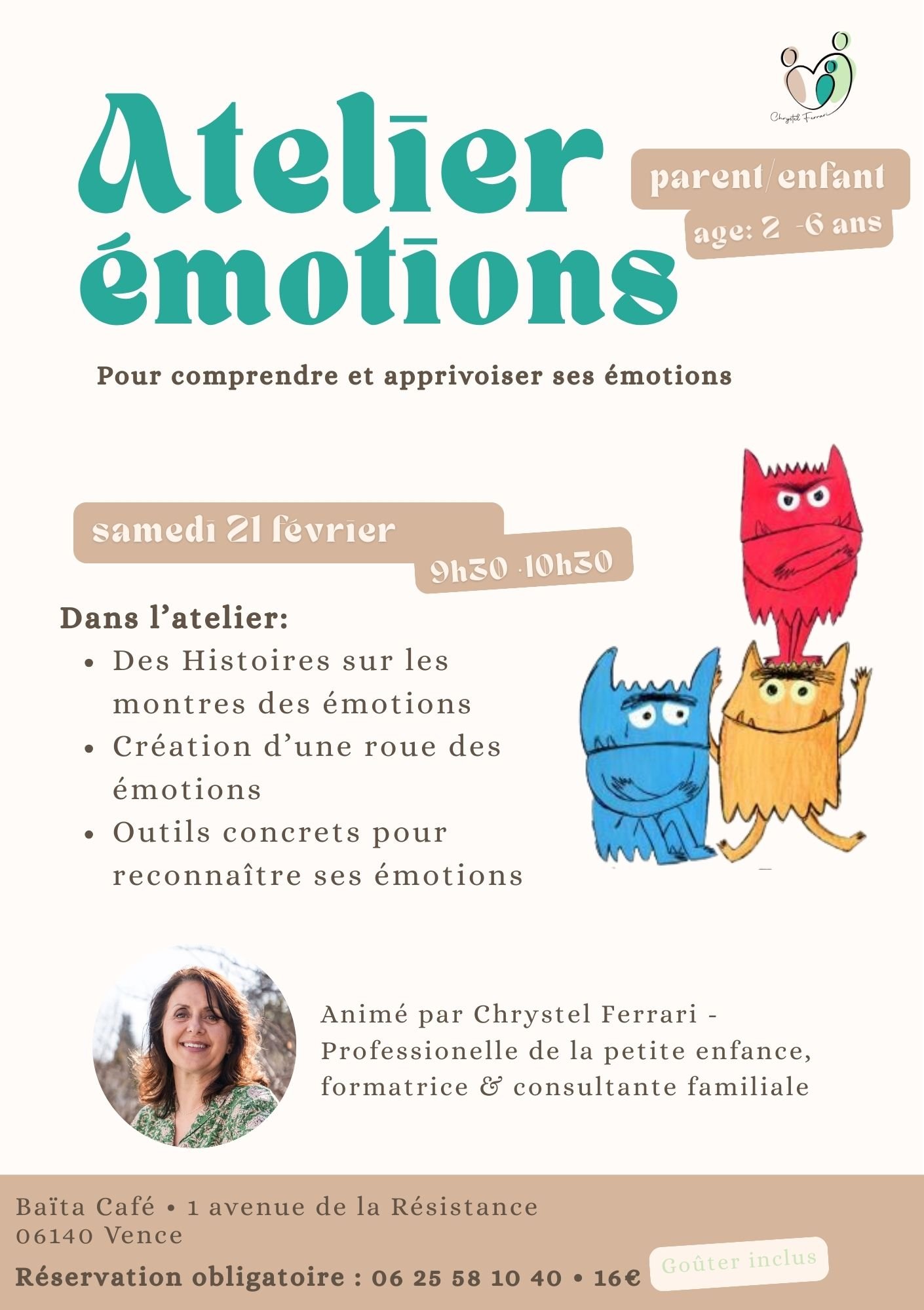 Côté pratique, un goûter est inclus, permettant de clôturer l’atelier dans un moment convivial et rassurant. Une belle idée de sortie famille autour des émotions et du bien-être des enfants.