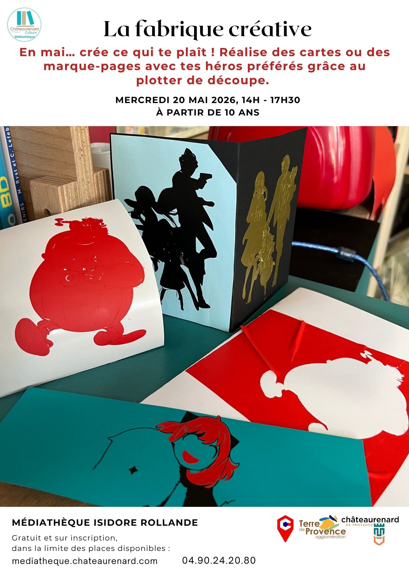 L’atelier fabrique créative Châteaurenard propose aux enfants à partir de 10 ans une activité originale mêlant créativité et outils numériques. Organisé le mercredi 20 mai 2026 de 14h à 17h30, cet atelier invite les jeunes à imaginer et créer leurs propres cartes ou marque-pages inspirés de leurs héros préférés.