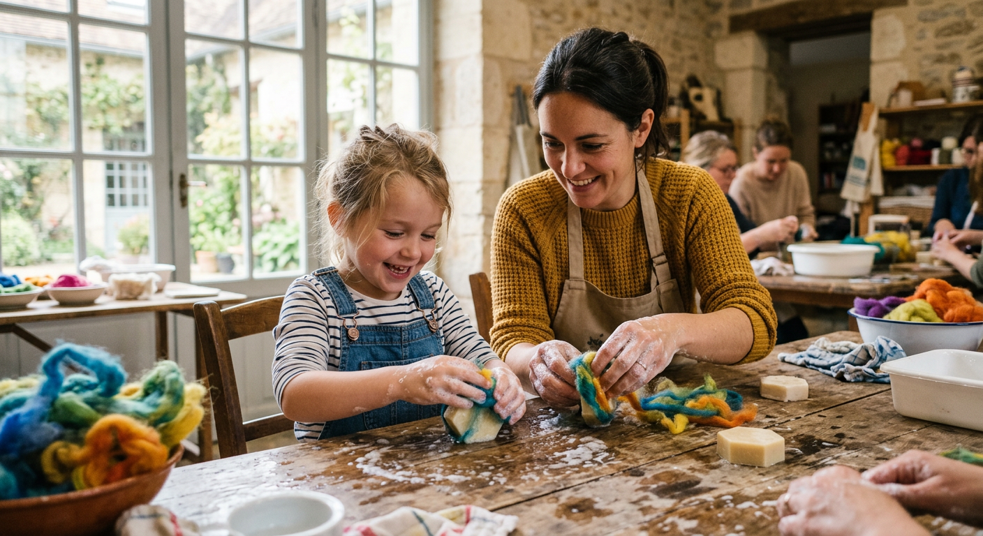 Parent Cool recommande cet atelier pour sa dimension tactile et ludique. Voir la laine se transformer en tissu grâce à l'eau et au savon est magique pour les enfants. C'est l'activité parfaite pour occuper une après-midi de vacances ou un week-end en Vendée, tout en sensibilisant les plus jeunes au travail de la matière naturelle.