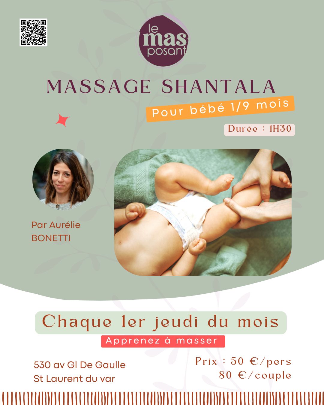 Adapté dès les premières semaines de vie, cet atelier massage bébé s’adresse à toutes les familles souhaitant partager une activité calme, rassurante et enrichissante. Le cadre est pensé pour accueillir parents et bébés dans des conditions confortables, accessibles et chaleureuses.