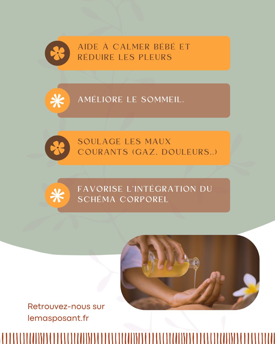 Le massage bébé favorise l’apaisement, soutient le lien d’attachement et aide les parents à mieux observer et comprendre les signaux de leur enfant. C’est aussi un temps précieux pour renforcer la confiance parentale et créer une bulle de sécurité affective.