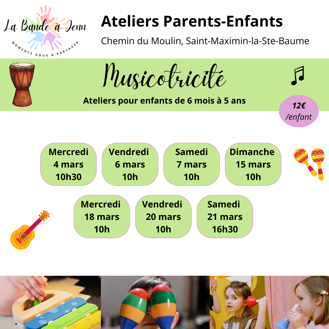 Cet atelier parent enfant à Saint-Maximin est une belle activité d’éveil pour les tout-petits. Il combine musique, mouvement et exploration sensorielle dans un cadre bienveillant, idéal pour une activité bébé dans le Var à partager en famille.