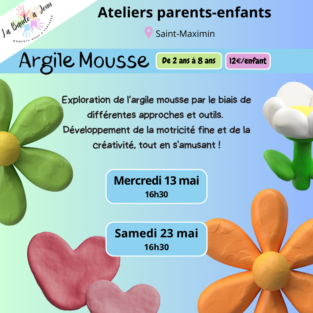 Cet atelier parents-enfants argile mousse Saint-Maximin organisé par La Bande à Jenn invite les familles à découvrir une matière sensorielle surprenante et ludique. Un moment de complicité à vivre ensemble à Saint-Maximin-la-Sainte-Baume.