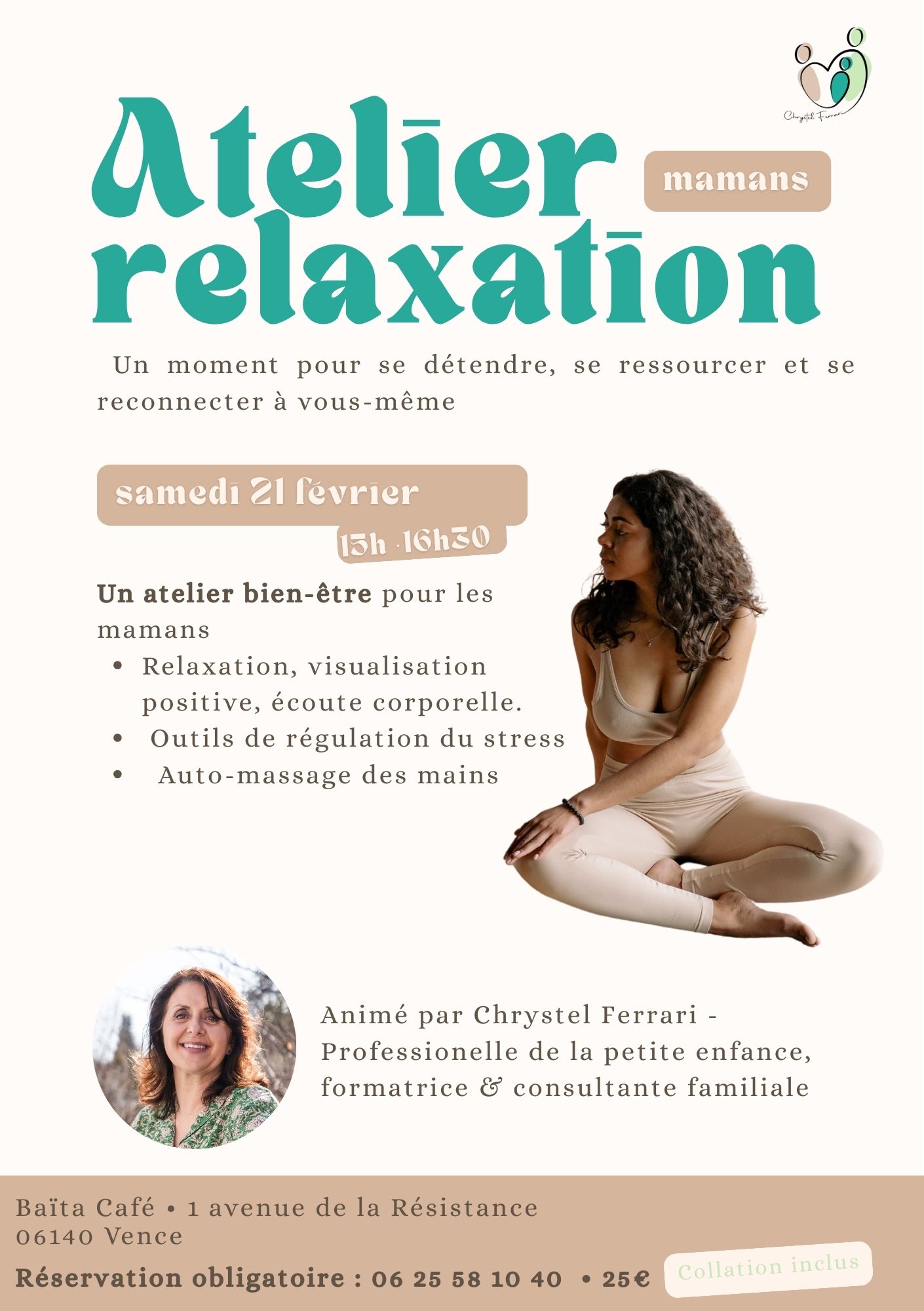 Une collation est incluse pour prolonger ce temps de pause dans une ambiance chaleureuse. L’atelier se déroule à Vence et s’adresse exclusivement aux mamans, sans enfants, afin de garantir un vrai moment pour soi.