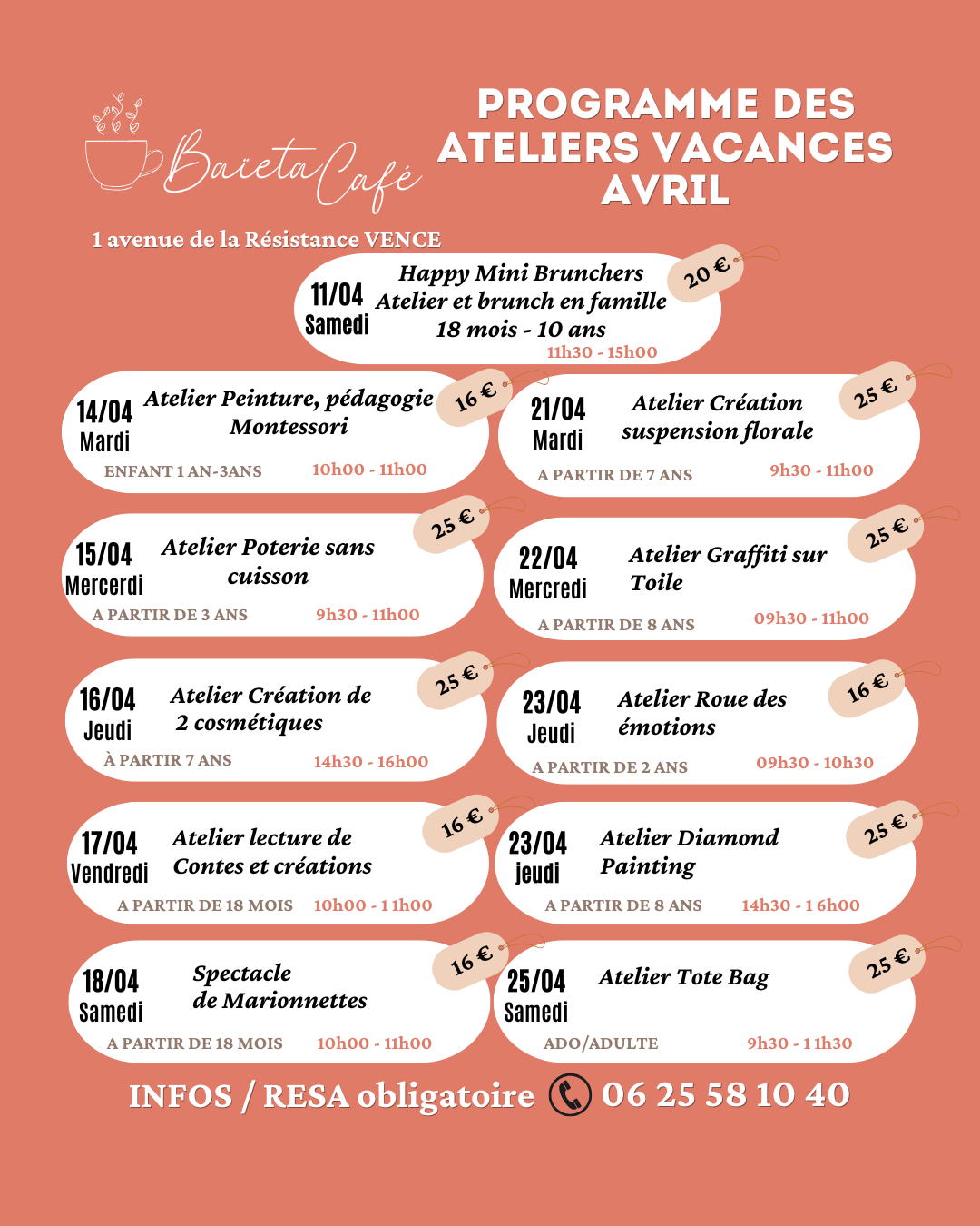 Côté pratique, les places sont limitées et la réservation est obligatoire. Les ateliers se déroulent à Vence, dans un lieu adapté aux familles.
