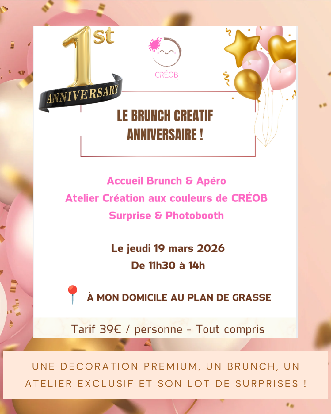 Le brunch créatif anniversaire CRÉOB Grasse est une belle occasion de prendre du temps pour soi dans une ambiance conviviale. L’atelier créatif et le format en petit groupe favorisent les échanges et la créativité. Une sortie originale à Grasse pour partager un moment inspirant. ✨