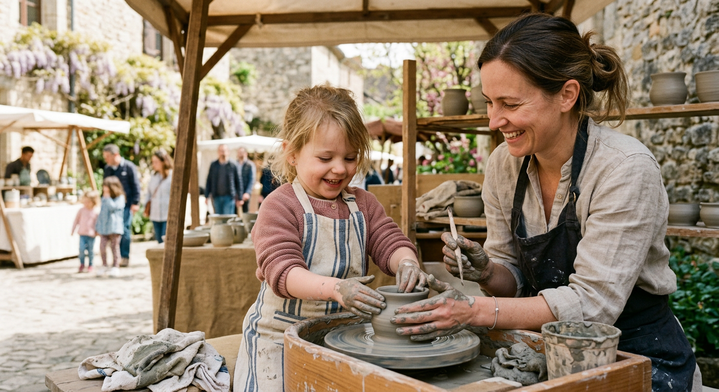 Le Marché de potiers Vouvant 2026 parle autant aux enfants qu’aux adultes, parce qu’il donne à voir un savoir-faire concret. Les plus jeunes comprennent vite comment une boule d’argile devient un bol, une tasse ou une pièce décorative, et cela rend la visite très vivante. L’atelier enfants poterie ajoute un vrai temps de participation, avec une approche sensorielle et créative qui plaît souvent dès la maternelle.