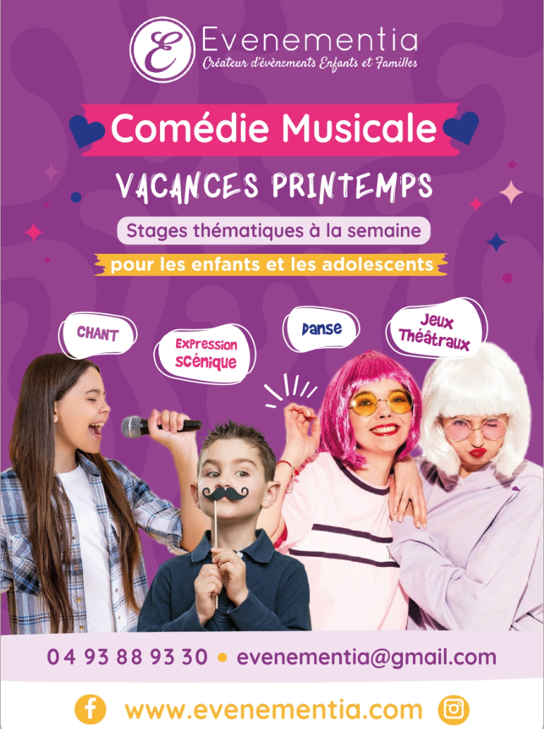 Pendant les vacances scolaires, Evenementia propose des stages de comédie musicale à Nice, spécialement conçus pour les enfants et adolescents, mêlant théâtre, danse, chant et expression scénique.